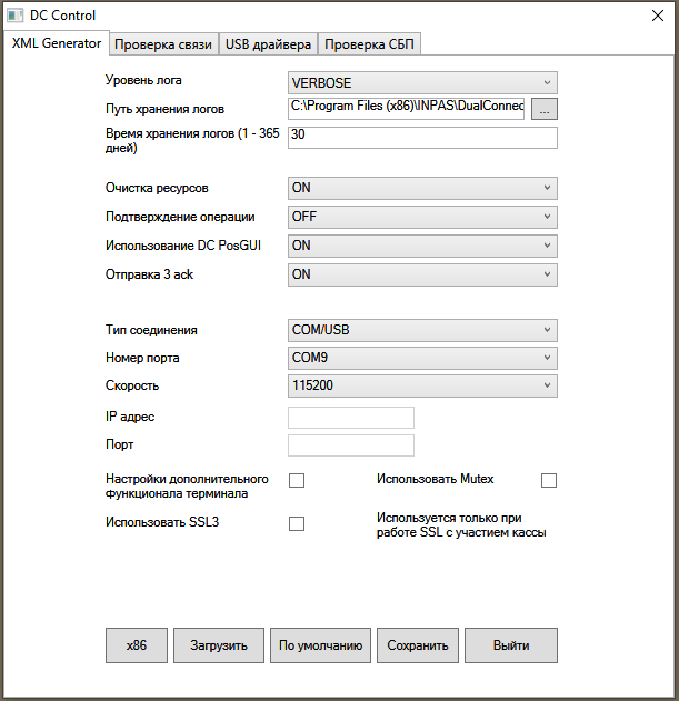В программе DC control нужно указать номер COM-порта и, при необходимости, другие параметры.